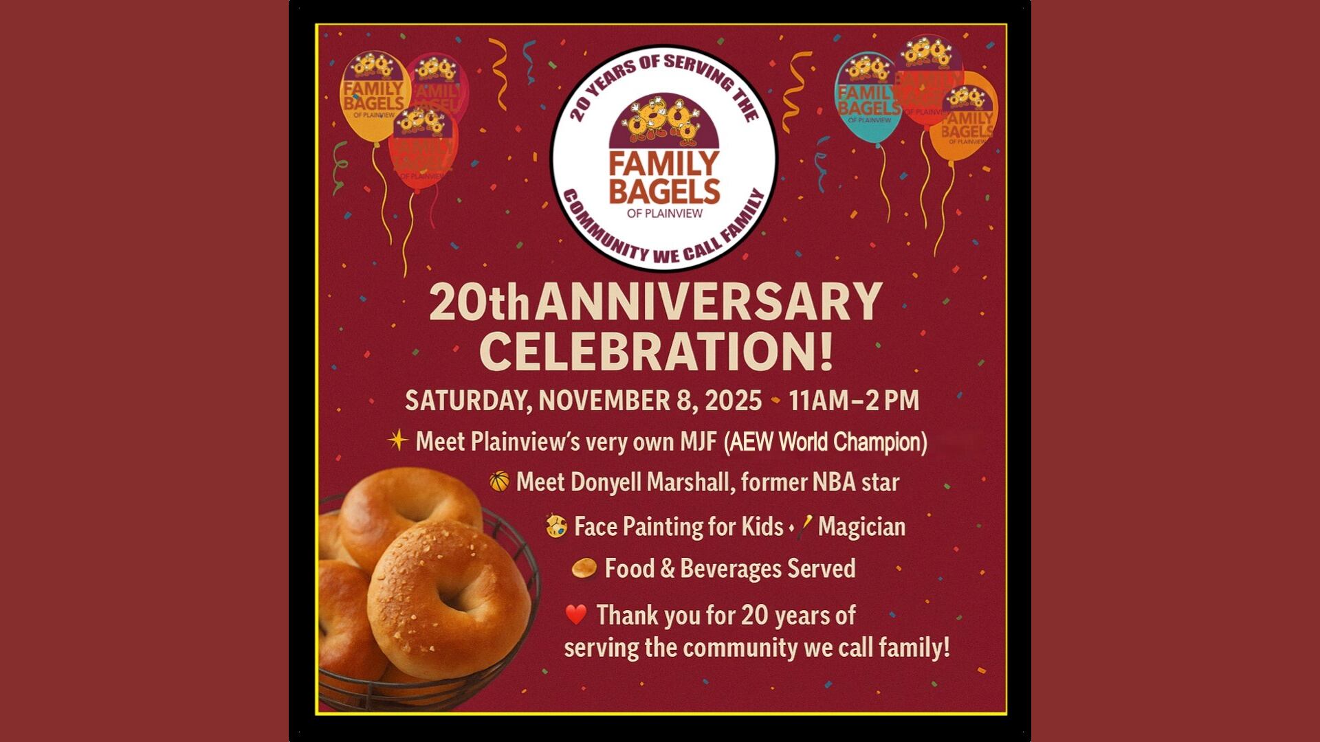 Join Family Bagels of Plainview as they celebrate their 20th anniversary this year on Saturday, November 8th from 11am to 2pm! Food & beverages will be served during the day and guest appearances by AEW World Champion MJK as well as former NBA star Donyell Marshall. Enjoy fun for the whole family as they celebrate 20 years of serving the community!