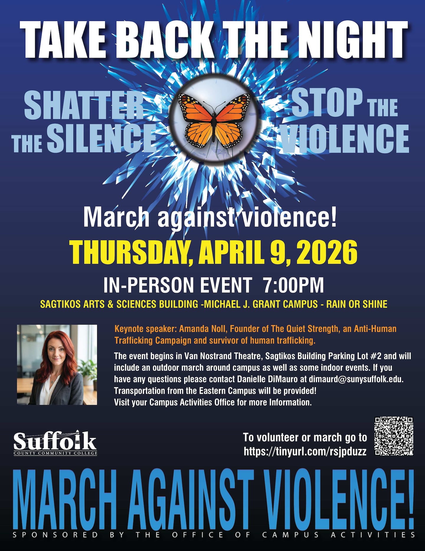This year’s march taking place on Thursday, April 9, 2026 at 7 p.m. at the Michael J. Grant Campus. This year, the keynote speaker is Amanda Noll, founder of The Quiet Strength, an Anti-Trafficking campaign; and survivor of human trafficking