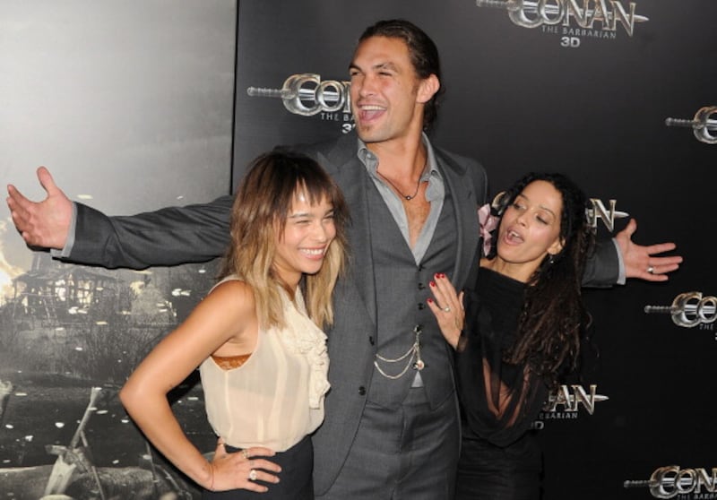 (L-R) Zoe Kravitz, Jason Momoa, and Lisa Bonet attend the world premiere of "Conan The Barbarian" held at Regal Cinemas L.A. Live on August 11, 2011 in Los Angeles, California.