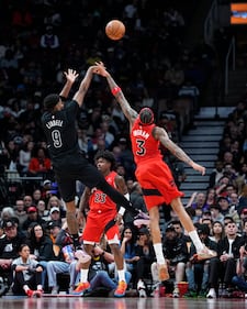 Brooklyn Nets v Toronto Raptors TORONTO, CANADA - APRIL 12: Brandon Ingram #3 of the Toronto Raptors goes to the basket against E.J. Liddell #9 of the Brooklyn Nets during the second half of their basketball game at the Scotiabank Arena on April 12, 2026 in Toronto, Ontario, Canada. NOTE TO USER: User expressly acknowledges and agrees that, by downloading and/or using this Photograph, user is consenting to the terms and conditions of the Getty Images License Agreement. (Photo by Mark Blinch/Getty Images) (Mark Blinch/Getty Images)
