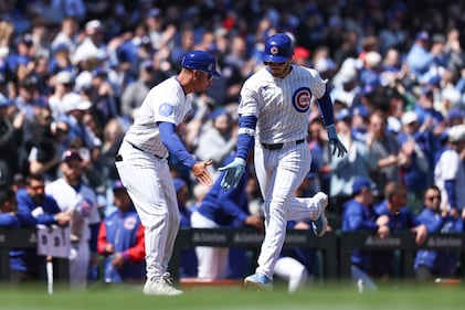 New York Mets v Chicago Cubs CHICAGO, ILLINOIS - APRIL 18: Ian Happ #8 of the Chicago Cubs celebrates with third base coach Quintin Berry #0 as he rounds the bases after hitting a home run during the second inning against the New York Mets at Wrigley Field on April 18, 2026 in Chicago, Illinois. (Photo by Geoff Stellfox/Getty Images) (Geoff Stellfox/Getty Images)